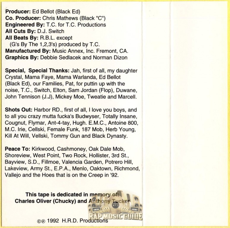 Genre: Rap Category: Cassette Tape Year: 1992 Release Type: 1st Press Record Label: H.R.D. Productions Produced By: Black C, T.C. Catalog #: CM-1 Area Code: 415 City: San Francisco State: California Tags: Black C, Mr. Cee, Hitman, RBL Posse