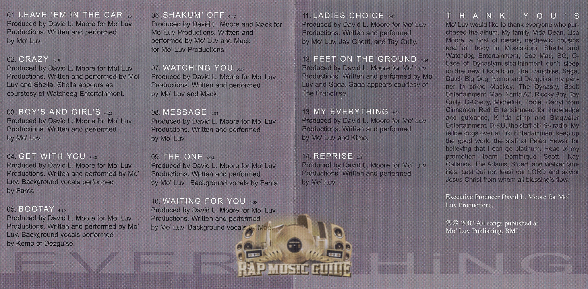 Genre: Rap Category: CD Year: 2002 Record Label: Raign Records Catalog #: MLCD-5733 Bar Code: 734015573326 Matrix/Ring Code: 6719 MO LUV EVERYTHING Area Code: 808 State: Hawaii