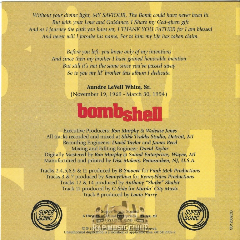 Genre: Rap Category: CD Year: 1996 Record Label: Super Sonic Sound, Sound Enterprises Catalog #: SS12002CD Bar Code: 601511200226 Case Type: Standard Jewel Case State: Michigan